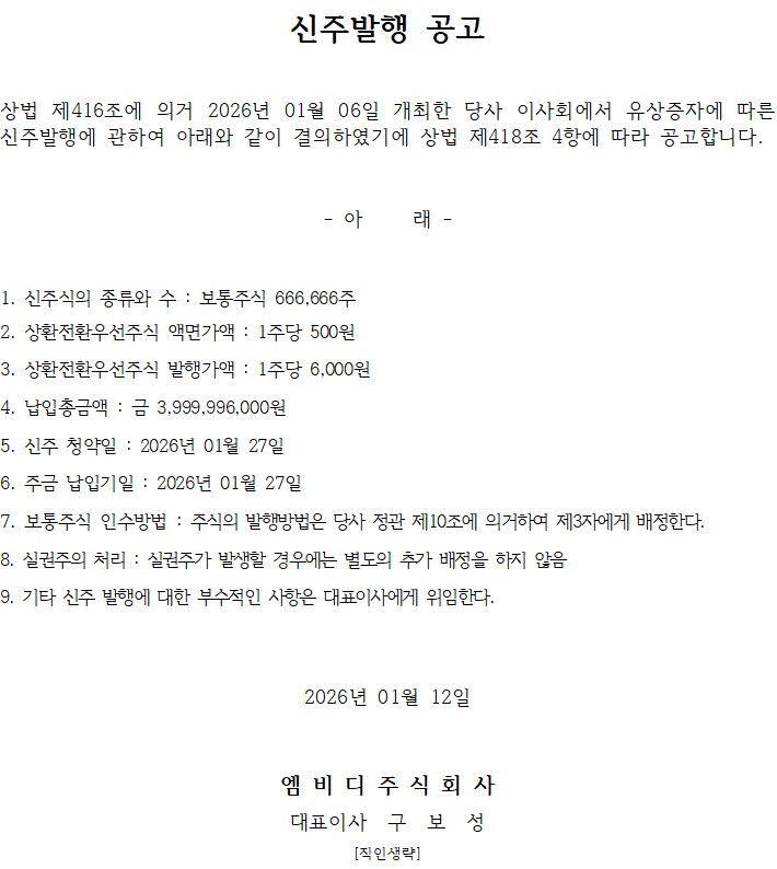 신주발행 공고 페이지 정보 작성자 MBD 댓글 0건 조회 194회 작성일 26-01-12 17:51 목록 본문 위와 같이 공지합니다. 다음글2025년 제1차 임시주주총회 소집 공고 25.11.03 댓글 0 댓글목록 등록된 댓글이 없습니다. 목록