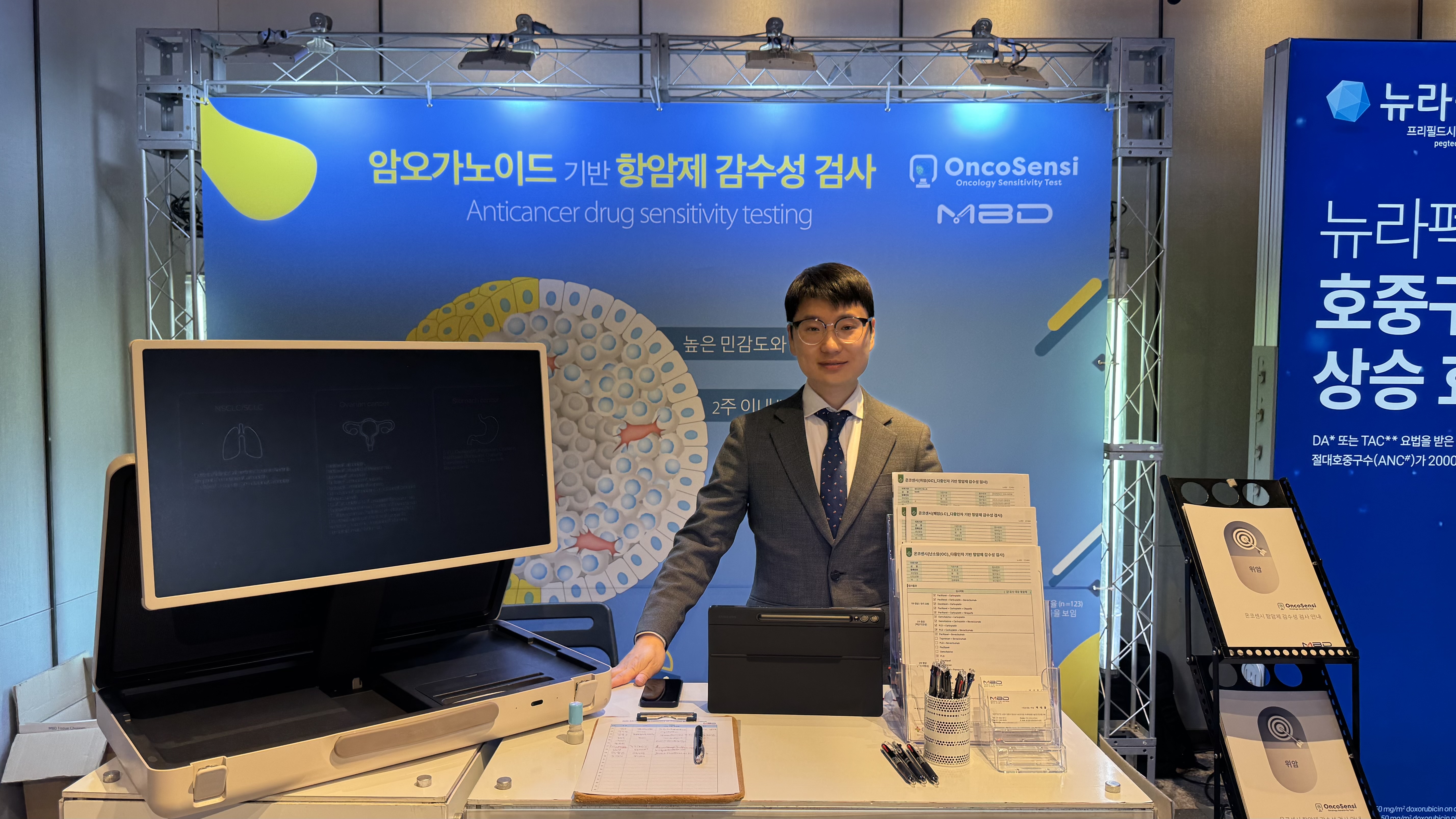 엠비디 부스에서는 고효율 자동화 기반 3D 암 오가노이드 스크리닝 플랫폼, OncoSensi® 항암제 감수성 예측 서비스, 정밀 의사결정을 위한 CODRP® 데이터 분석 솔루션, 비임상시험 및 환자 유래 오가노이드 기반 CRO 서비스를 중심으로 기술을 소개했습니다.